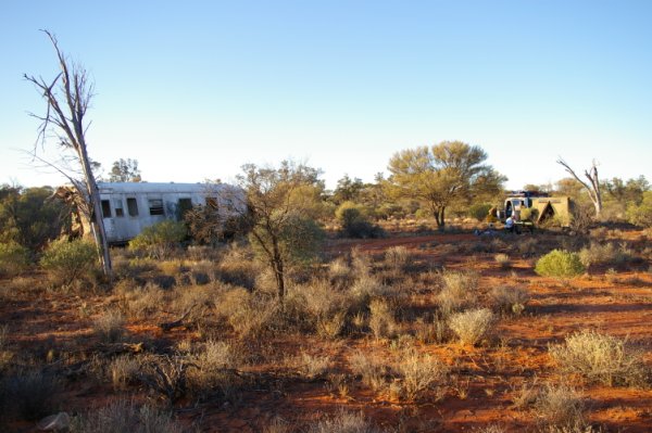 Thr. 22/05/08 packed and gone at 8.00 am we travelled down the Stuart to Glendambo filling up the tanks with as much diesel as I could get in, then off to finish our three trip quest to travel the Trans line access road. Knowing the road out to Kingoonya was a very good dirt road I left the tyres at road going pressures (small mistake), we got to Kingoonya and had a look around they should have fuel bowsers up and running soon. Leaving Kingoonya the road was still a good track sticking to the 80 km/hr rule we pushed on having a look at Tarcoola and other sidings, there where a lot of Transfield, Telecom and other workers using the road, we where passing 8 ton tippers that were side ways on corners. The road was starting to get a little chopped up, still hadn’t lowered the tyre pressures or engaged the free wheeling hubs, I was travelling at around 60 -70 km/hr and hit some bull dust, and now we are sideways heading up the embankment turning right but going left, a lot of this was my fault as I let the thing pull up under it’s own steam, I didn’t use the clutch and drop some gears. (I was a bit busy) We came to a stop, I was hoping for on all fours, got out had a look around, put the hubs in and reversed out travelling up the track till I found somewhere to pull off and lower the tyre pressures, we took the standard 10 psi out of all 4. We got to an old train crash site .6 km east of Mount Christie where we camped the night.